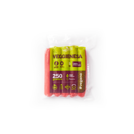 Veggienesa (Salchicha tradicional) hecha 100% a base de proteína de plantas. Vegano, sin colesterol y libre de grasas trans.Formato: 5 unidades (250 gramos).Marca: Vegusta.Ingredientes: Proteína de soya No GMO, proteína de trigo, agua filtrada, aceite vegetal de maravilla, sal reducida en sodio, saborizante idéntico natural (apio), humo líquido, cebolla en polvo, ajo en polvo.