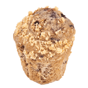 Quequito de vainilla y canela con arándanos naturales en su interior y topping crocante.