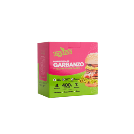 Hamburguesa vegana hecha 100% a base de proteína de plantas. Vegana, sin gluten, sin soya, sin colesterol, libre de grasas trans, enriquecida con B12.Formato: 4 unidades (400 gramos)Marca: VegustaIngredientes: Garbanzos, avena, agua filtrada, almidón de papa, pimentón fresco, proteína de chía, cebolla deshidratada, manteca de palma, aceite vegetal, cilantro fresco, ajo, curry, pimienta negra, sal reducida en sodio y vitamina B12.