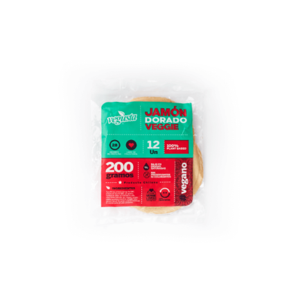 Jamón dorado hecho 100% a base de proteína de plantas. Vegano, sin colesterol y libre de grasas trans.Fromato: 12 láminas (200 gramos).Marca: Vegusta.Ingredientes: Agua filtrada, proteína de trigo, proteína de soya No GMO, carragenina, Manteca de palma, sal, saborizantes naturales, ajo, orégano, comino, cebolla, guanilato e inosinato de sodio, sabor idéntico natural.