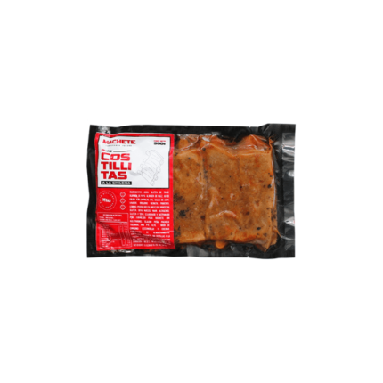 Costillas de seitan a la ChilenaGramos: 300Marca: MacheteIngredientes: Agua, gluten de trigo, almidón de papa, almidón de maíz, ají de color, ajo en polvo, sal, salsa de soya, vinagre, orégano, merkén, pimienta, comino. Contiene gluten, soya y trigo. Puede contener trazas de nueces y maní.