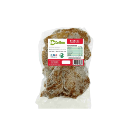 Bistec de Seitán, libre de sellos. Contiene Gluten y Soya.Formato: 500 gramos.Marca: Mr seitan.Ingredientes: Agua, Harina de gluten, Salsa de soya (agua, poroto de soya, sal, harina de trigo, caña de azúcar, color caramelo, glutamato monosódico, inosinato disódico, guanilato disódico, sorbato de potasio, benzoato de sodio), Salsa de ajo (agua, vinagre, ajo, maltodextrina, sal, azúcar, almidón de maíz modificado, goma xantan, dióxido de titanio, saborizante natural, sorbato de potasio, benzoato de sodio, goma guar). Contiene gluten y soya.