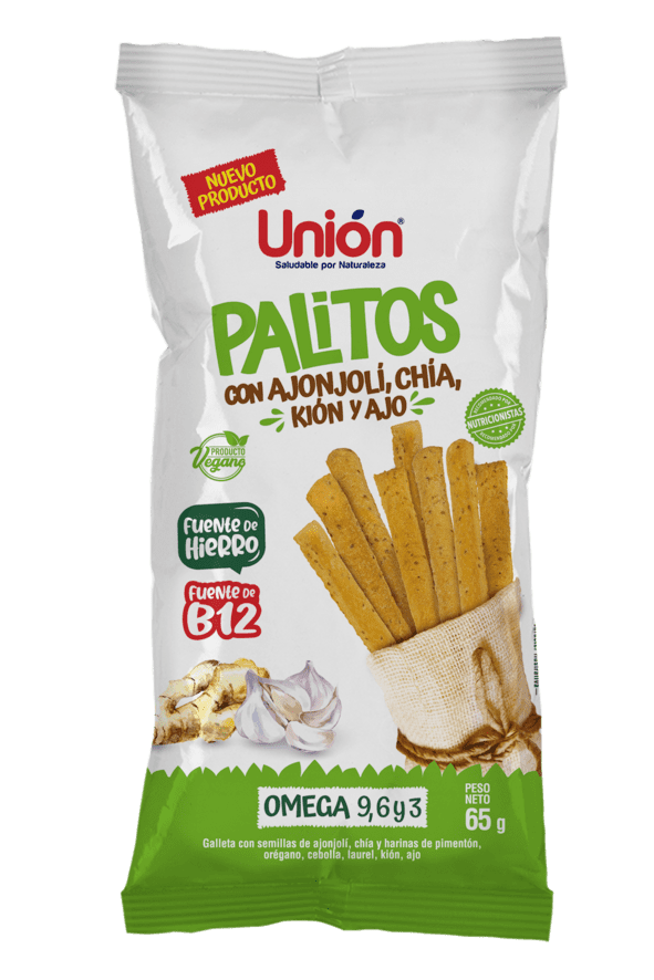 Estos deliciosos palitos con ajonjolí, chía, kión y ajo, están elaborados en base a harina fortificada hierro y vitaminas B12. Libre de bromato y colesterol. Este producto es un alimento fuente de hidratos de carbono complejos, principal fuente de energía del organismo. Contiene Omega 9, 6 y 3.