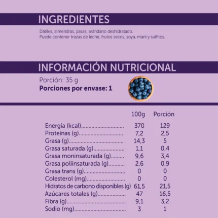 Barrita 100% natural en base a dátiles y frutos secos, con sabor a arándano. Es una barrita ideal para deportistas, colaciones y snack de media mañana.Sin gluten | Sin colorantes artificiales | Sin preservantes | Sin maltitol | Vegano | Libre de sellos |Sin azúcar añadida